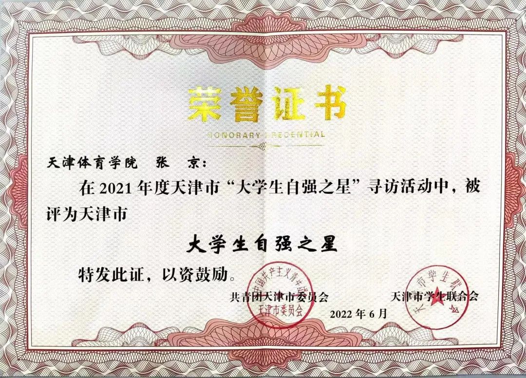 经过院级推荐、校级评审、市级遴选,我校运动训练科学学院2021级硕士研究生张京,体育文化学院2018级本科生李雪娜获得2021年度天津市“大学生自强之星”荣誉称号。