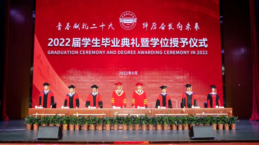 青春献礼二十大,踔厉奋发向未来。天津体育学院2022届学生毕业典礼暨学位授予仪式于2022年6月28日在大学生活动中心报告厅隆重举行。天津体育学院党委书记张立顺,党委副书记、院长张欣,党委常委、副院长宋爱军,党委常委、市纪委监委驻天津体育学院纪检监察组组长张洺涛,党委常委、组织部部长叶加宝,党委常委、宣传部部长刘原,党委常委、统战部部长依惠琴出席毕业典礼。学校各党政部门、教辅单位主要负责同志,各二级教学单位全体班子成员,全体教研室主任、研究生导师、辅导员,以及全体2022届毕业生在线下和“云端”齐聚一堂,共同欢庆毕业盛典。毕业典礼由党委常委、副院长张卫国主持。