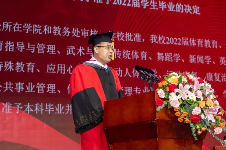 毕业典礼在升国旗仪式中拉开帷幕。宋爱军宣读天津体育学院2022届优秀毕业生表彰决定。教务处处长金宗强宣读天津体育学院2022届本科毕业生学位授予决定。科研与研究生处处长徐金陆宣读天津体育学院2022届硕士、博士毕业生学位授予决定。主席台就坐领导向优秀毕业生代表颁发荣誉证书和纪念品,向本科、硕士毕业生代表颁发了学位证书和毕业证书。张欣为到场的3名博士毕业生代表颁发了学位证书和毕业证书。
