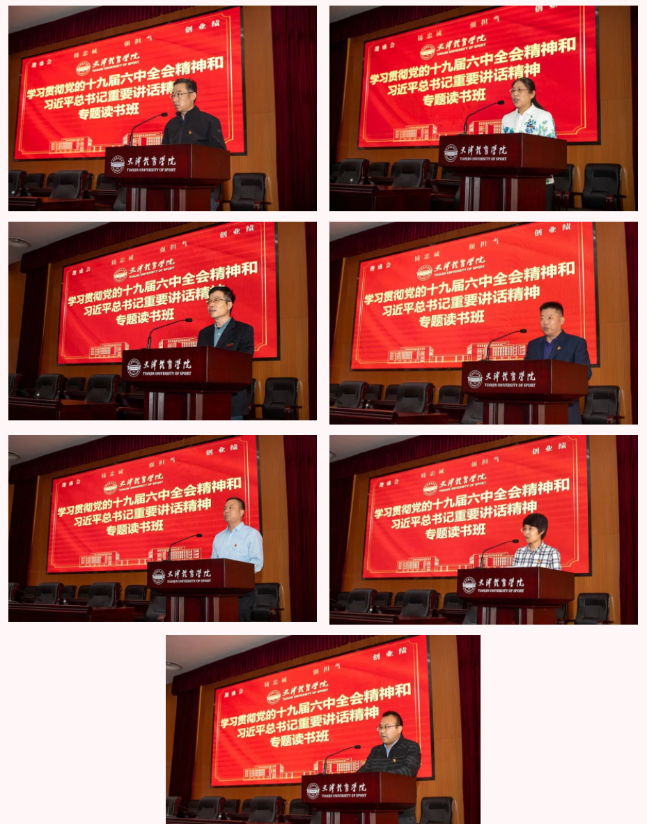 13日下午,专题读书班举行总结交流会。副院长宋爱军,人事处处长岳游松,马克思主义学院直属党支部书记杨书红,体育教育与教育科学学院党委副书记、院长孙延林,运动训练科学学院党委书记张志斌,社会体育与健康科学学院党委书记于宝明,体育文化学院党委副书记徐蕾,体育经济与管理学院党总支副书记、院长陈洪分别结合本职工作谈了学习体会。
