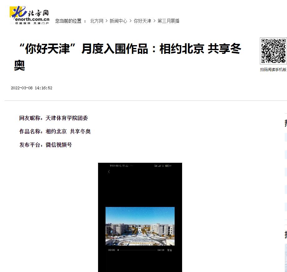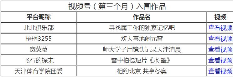 日前,经抖音、快手、微信视频号、新浪微博、津抖云五个平台按照“网络热度”的推荐,由评委会进行评分,“你好,天津”网络短视频大赛最终确定210个作品入围第三个月赛。我校团委微信视频号参赛作品《相约北京、共享冬奥》入围。