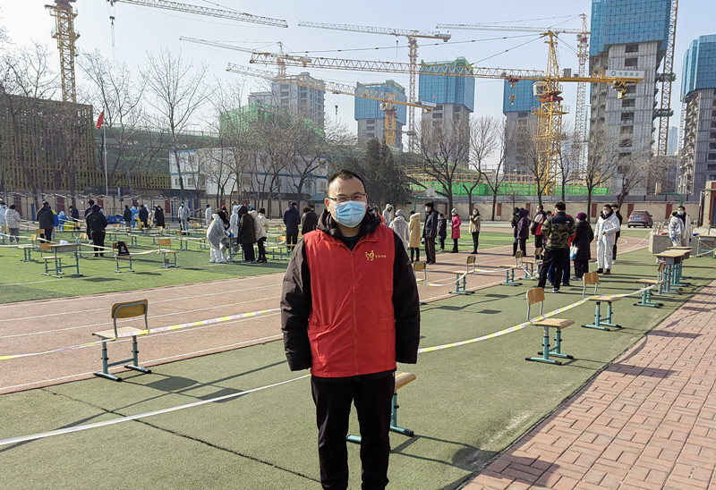 阎峰,中共党员,大数据管理与应用教研室教师,在滨海新区天津中新生态城宜禾社区负责采样辅助工作,为提高采样效率、减少居民等候时间助力。