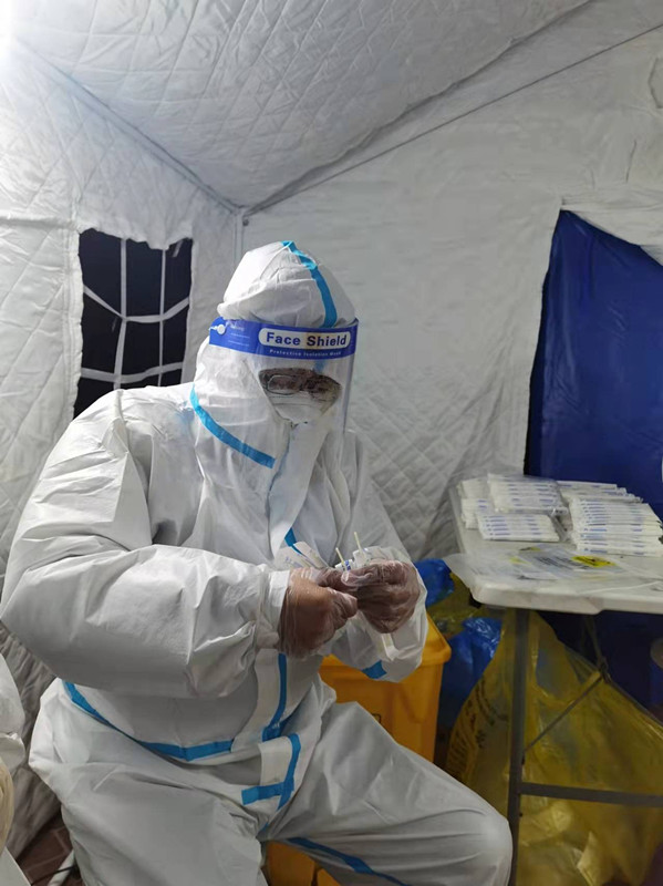 赵华,大数据管理与应用教研室教师,在河东区上杭路街道第六大道参与核酸筛查通知、现场秩序维护和人员引导等工作。