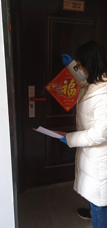 赵婷婷,中共党员,大众健身指导与管理教研室教师,负责静海区华康街道依水郡小区、六和茗著小区入户登记居民信息、宣传核酸筛查政策等。