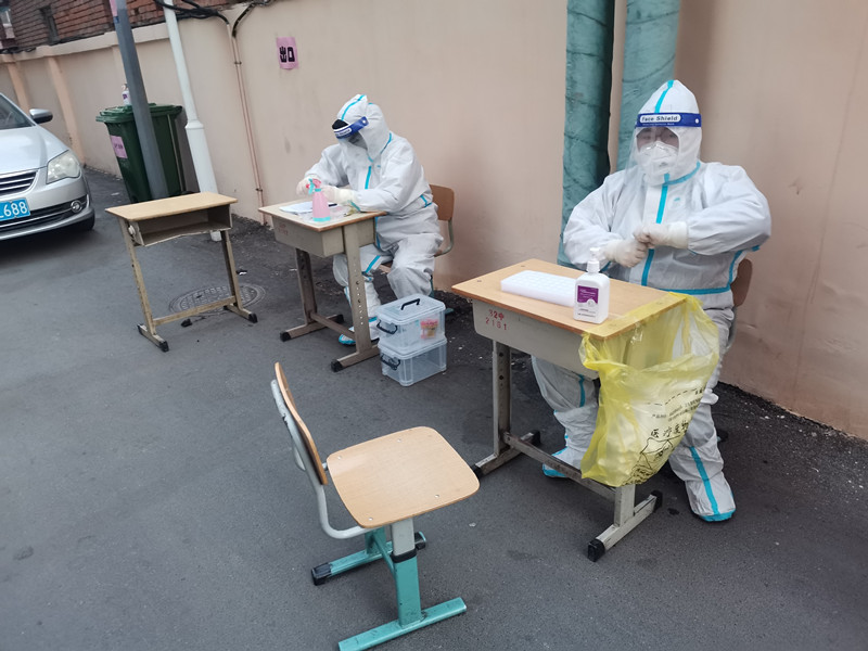芦劼明,学院办公室副主任,在河东区春华街道华康里社区筛查点,负责样品登记、装袋、转运等工作。
