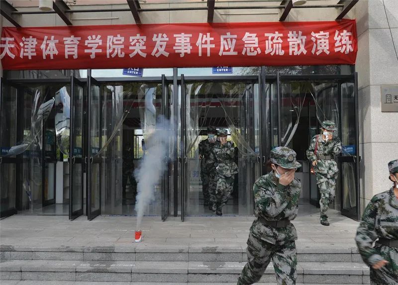 在疏散演练环节,突发事件的演练场景为烟雾弹模拟的火灾场景。接到学生火灾报警后,校消防控制室立即启动1-9号宿舍楼消防报警系统。同学们用湿毛巾捂住口鼻,在疏散引导员和军训教官的指引下迅速有序撤出宿舍楼,并按照既定的应急疏散方案、路线,撤离至指定地点。党委安全工作部配合团泊西中队消防员迅速扑灭模拟火源,让师生身临其境地感受火灾场景。