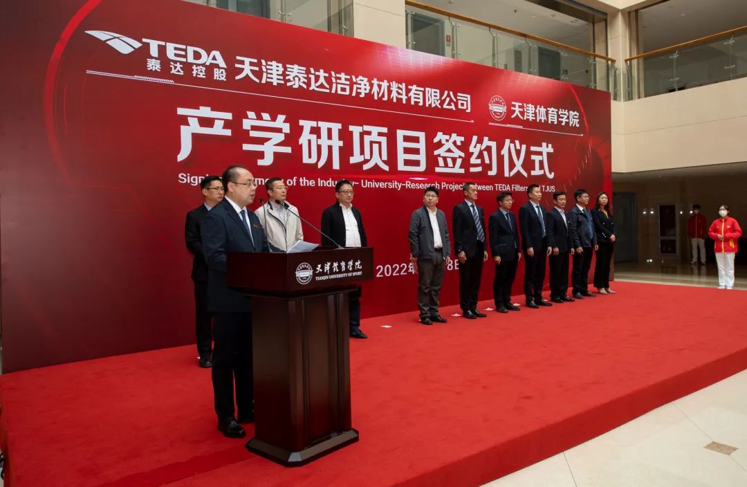 天津泰达股份有限公司党委书记、董事长张旺在致辞中表示,天津体育学院与天津纺织集团和泰达洁净,就运动口罩研发开展了产学研用合作,通过三方努力,在运动口罩研发方面取得了明显的成果。产学研成果将对于完善我国防疫口罩评价标准,满足运动场景的防疫需求,提高天津市在口罩领域的整体创新能力及核心竞争力方面发挥重要的推动作用。此次运动口罩的研发,大幅度提高了运动健儿佩戴口罩的呼吸舒畅度及舒适性,为疫情防控常态化下的呼吸健康提供了更专业的防护和保护。泰达洁净材料有限公司与天津体育学院,将深化校企合作体制创新,为科学研究、成果转化发挥积极作用,为区域经济社会发展提供强有力的科技支撑。