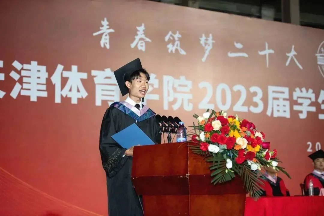本科毕业生代表杨帆发言并带领全体毕业生庄严宣誓,号召大家与时代同行,勇担体育强国使命,为实现中华民族伟大复兴的中国梦奋斗终身。