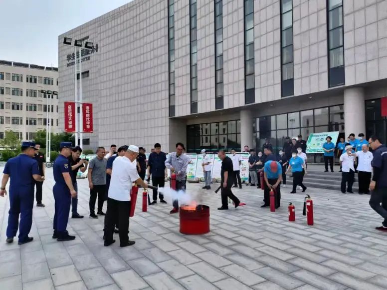6月16日,在生活服务楼前广场,学校组织开展了安全生产集中宣传活动,并邀请属地消防救援部门为食堂后厨员工、楼内秩序员、保安人员,以及变电站、能源站运维等工作人员,进行自救互救技能培训和灭火器实操讲解及演练。活动中,消防指战员重点为食堂后厨工作人员进行了灶台灭火,以及消火栓、灭火毯使用的实操讲解及技能培训。通过培训演练,从业人员进一步明确了安全生产岗位责任,掌握了灭火技能,熟悉了安全逃生路线,提升了应对突发火险的能力。
