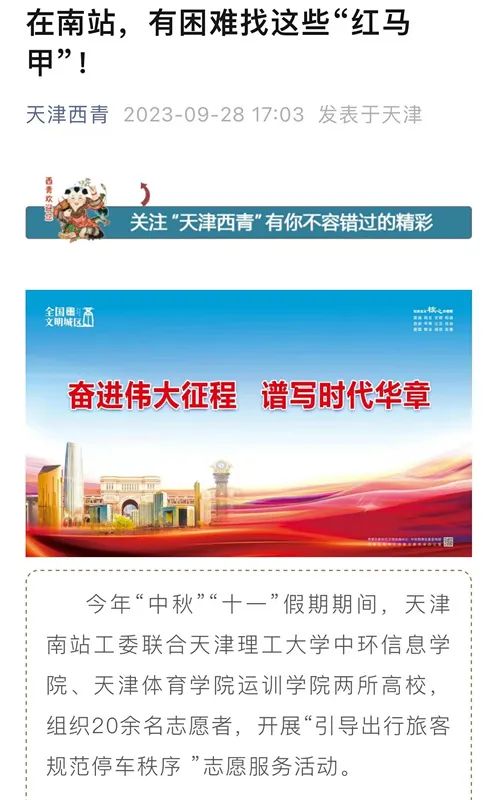近日,我校运动训练学院“思韵悠长、真理远航”理论宣讲团队志愿者在天津南站开展“引导出行旅客、规范停车秩序”等志愿服务活动,助力天津“十项行动”,保障假期旅客安全出行。北方网、西青区官方微信“天津西青”对我校志愿者活动进行了报道。