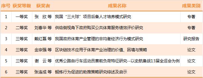 近日,天津市社会科学优秀成果评奖委员会办公室公布第十八届天津市社会科学优秀成果奖评选结果,我校共有6项成果获奖,其中一等奖1项、二等奖1项、三等奖4项,实现了获奖等级和获奖数量的双突破。获奖成果中,张欣教授的专著《我国“三大球”项目后备人才培养模式研究》荣获一等奖,这是我校教师首次获得天津市社会科学优秀成果奖一等奖,实现了该奖项一等奖“零”的突破。