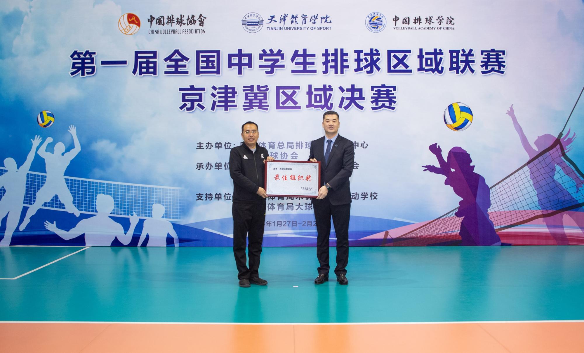 国家体育总局排球运动管理中心副主任袁磊为天津体育学院颁发最佳组织奖。