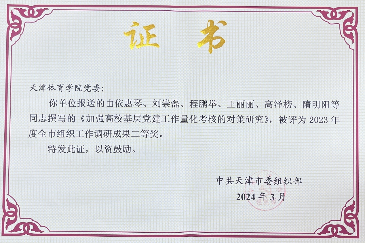 日前,市委组织部公布2023年度全市组织工作课题调研成果获奖情况,我校党委常委、党委统战部部长、机关党委书记依惠琴作为课题负责人上报的《加强高校基层党建工作量化考核的对策研究》荣获天津市2023年度组织工作调研成果二等奖。