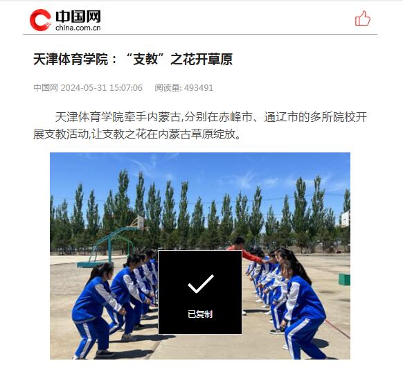 2024年5月,我校40名优秀学生和2名带队教师组成支教志愿服务团,赴赤峰市宁城县、通辽市库伦旗开展为期60天的体育支教工作。连日来,包括中国网、中国新闻网在内的多家媒体,对我校支教志愿服务团在内蒙古开展支教工作情况进行了报道。