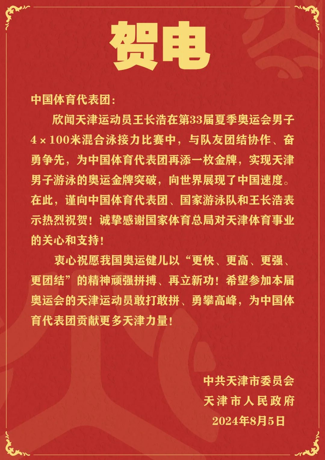 市委市政府电贺王长浩获巴黎奥运天津首金!