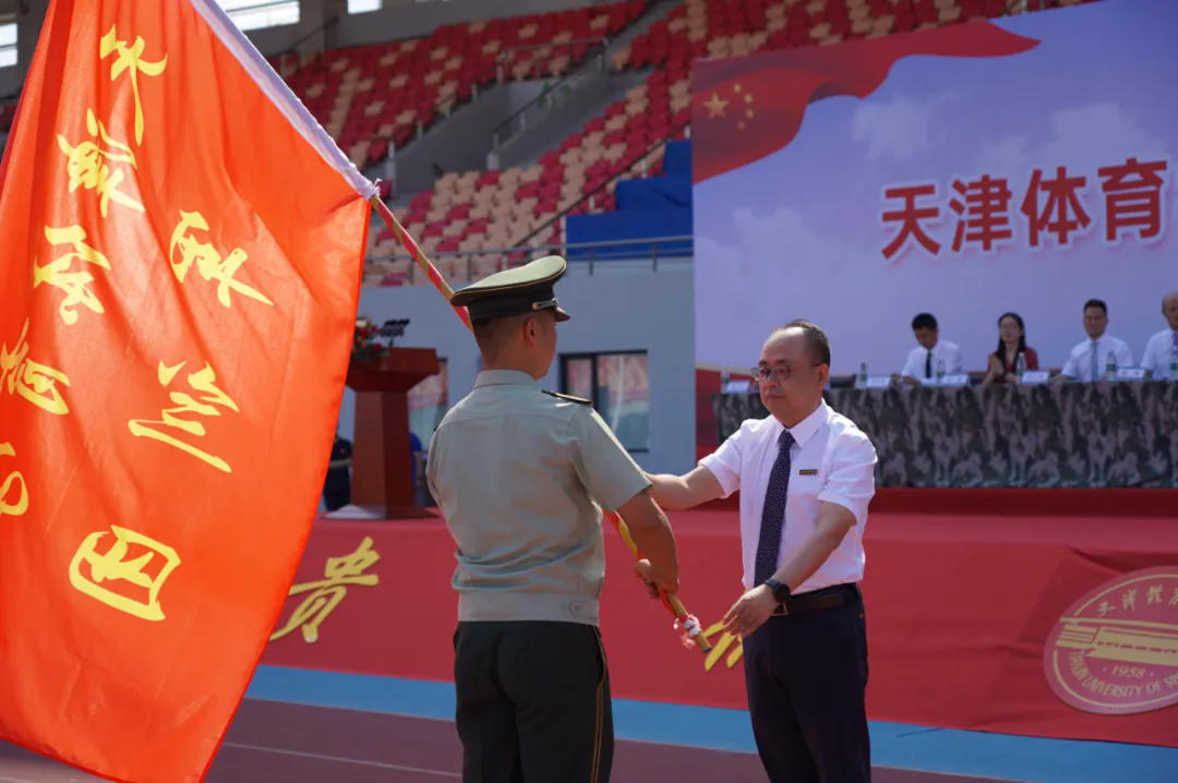 宋爱军向军训教官代表王垚同志授军训团旗。