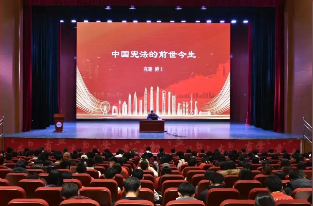 讲座伊始,高璐老师通过身边的生动案例作为引导,围绕六大主题——“宪法的起源、宪法的演变历程、宪法的修正历史、宪法的现代发展、宪法的实施与监督、宪法的国际影响”进行了深入讲解。他以清晰的时间线和详实的案例分析,将枯燥的法律知识转化为鲜活的学习内容,令现场学生耳目一新、兴趣盎然。讲座尾声,高璐寄语全体学生:要尊崇宪法,学会用法律的武器维护自身合法权益,以宪法为指引,走好人生每一步。