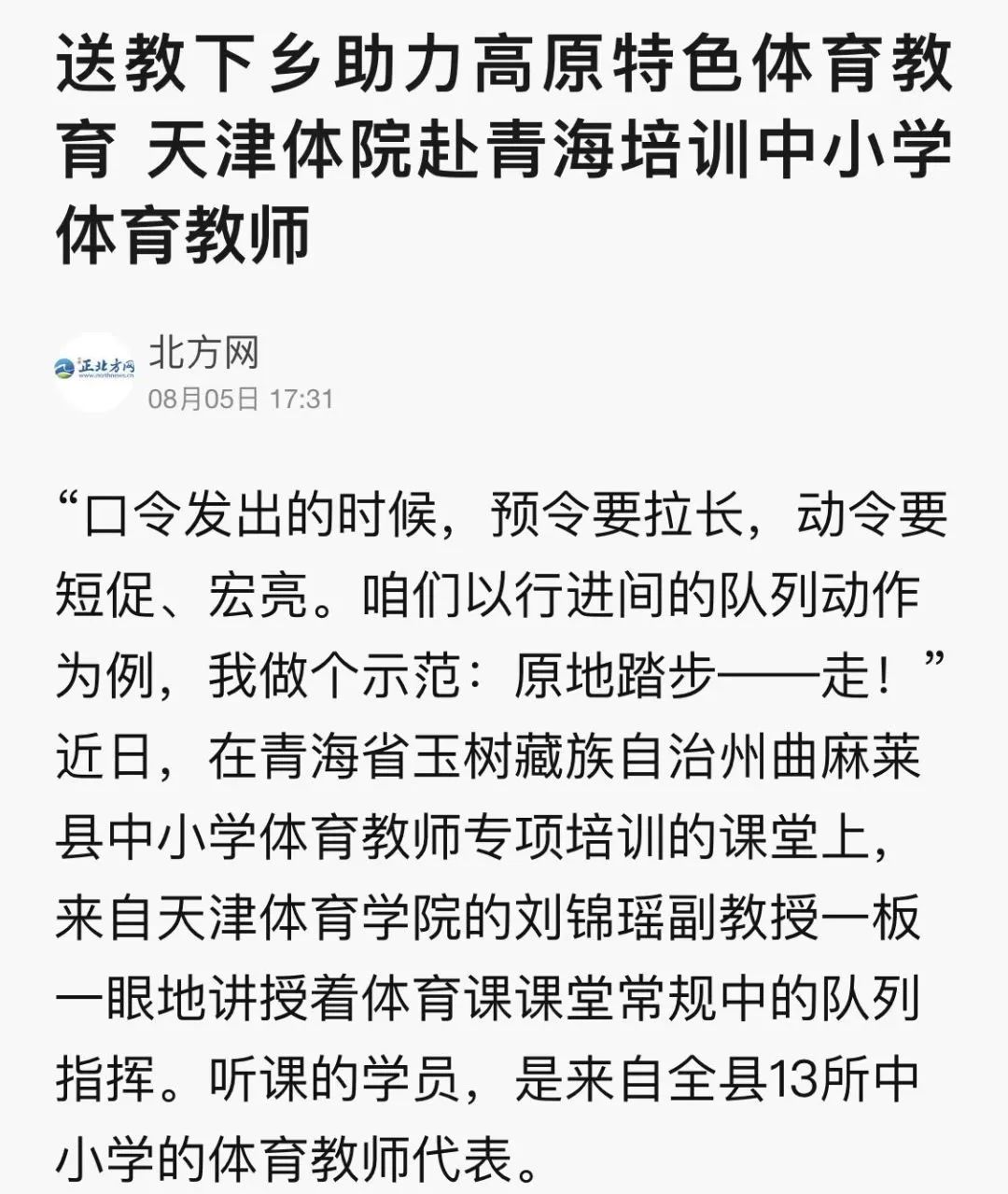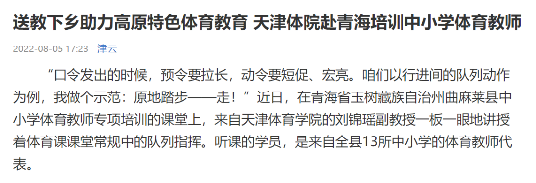 日前,我校教师赴青海省玉树藏族自治州曲麻莱县,为当地中小学体育教师开展专项培训。包括人民网、中国教育新闻网、天津日报新媒体、北方网、津云、天津教育报新媒体等在内的中央和我市多家媒体,对此进行了报道。