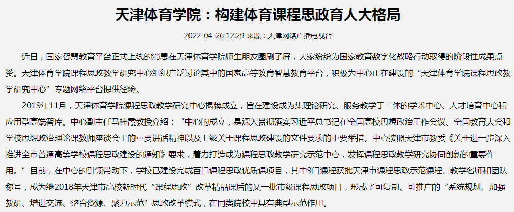 日前,津云、北方网、天津网络广播电视台等我市主要媒体报道我校全面推进课程思政建设,构建体育课程思政育人大格局。