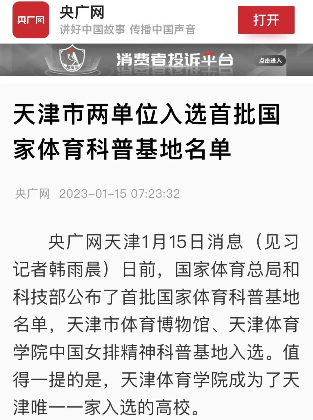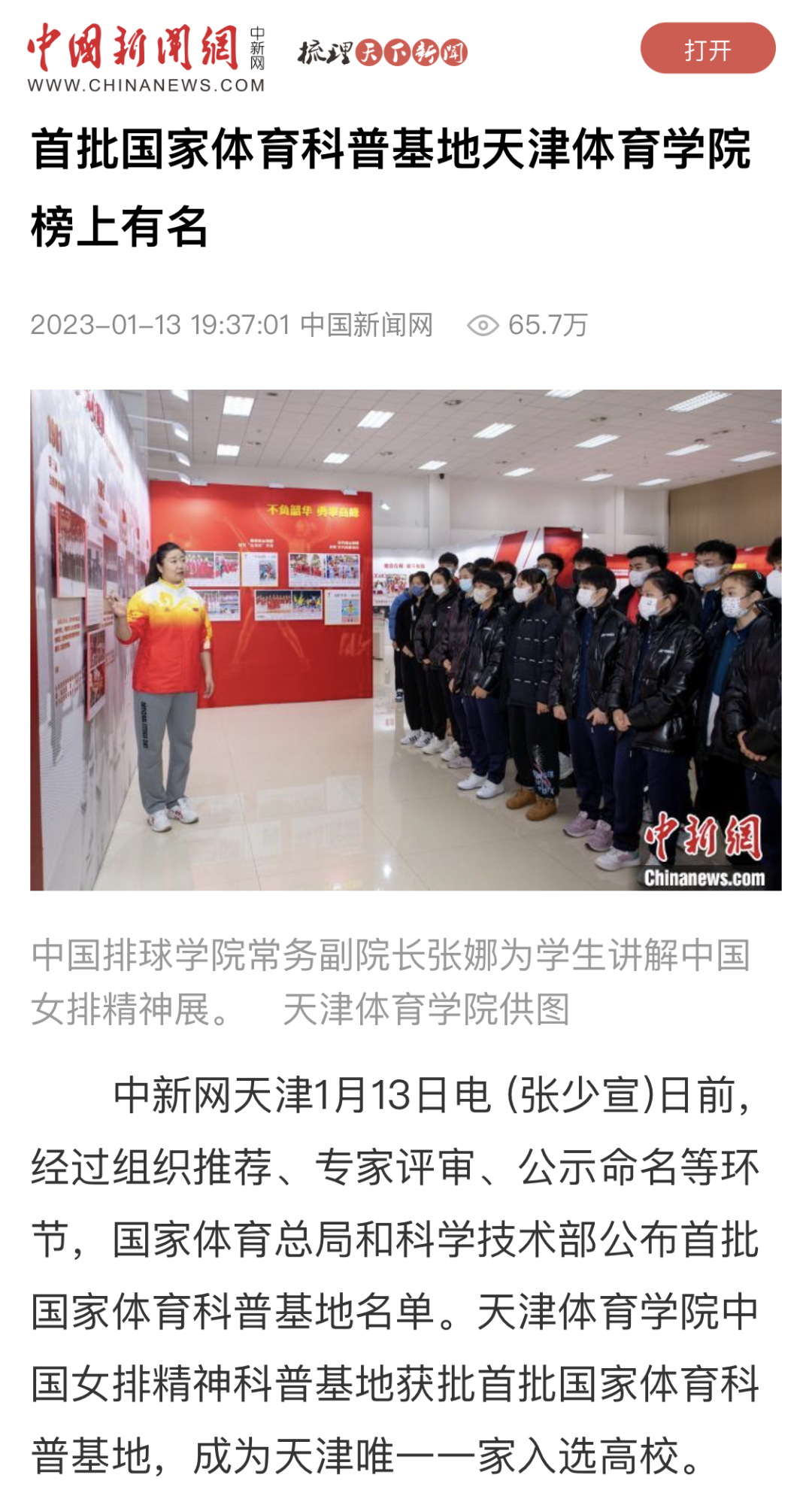 近日,国家体育总局和科学技术部公布首批国家体育科普基地名单。经过组织推荐、专家评审、公示命名等环节,我校中国女排精神科普基地获批首批国家体育科普基地。央广网、中国新闻网、学习强国、天津日报新媒体、津云、天津教育报新媒体等中央和我市多家媒体对此进行了报道。