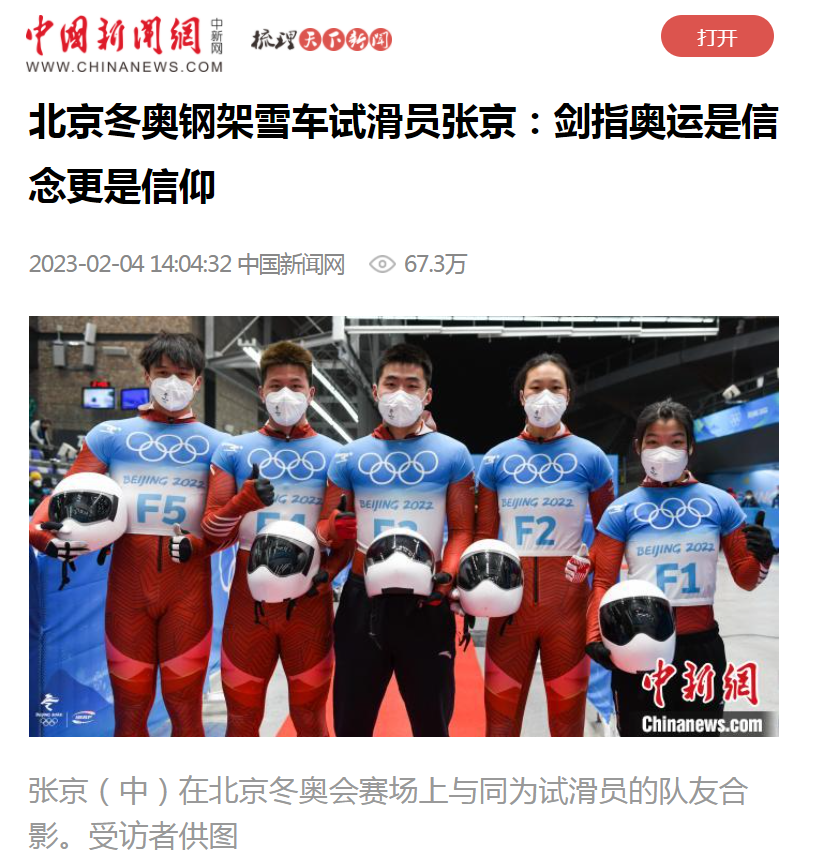 2023年2月4日,北京冬奥会成功举办一周年之际,中国新闻网以“北京冬奥钢架雪车试滑员张京:剑指奥运是信念更是信仰”为题,对我校学子张京进行报道。现全文转载。