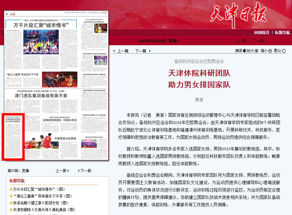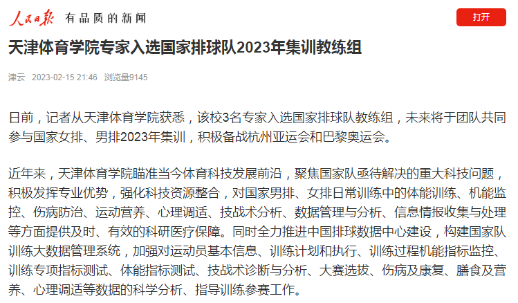 近日,人民日报客户端、中国新闻网、《天津日报》、津云、《天津教育报》等中央和我市多家媒体对我校科研团队全面助力国家男排、女排备战巴黎奥运会进行了报道。