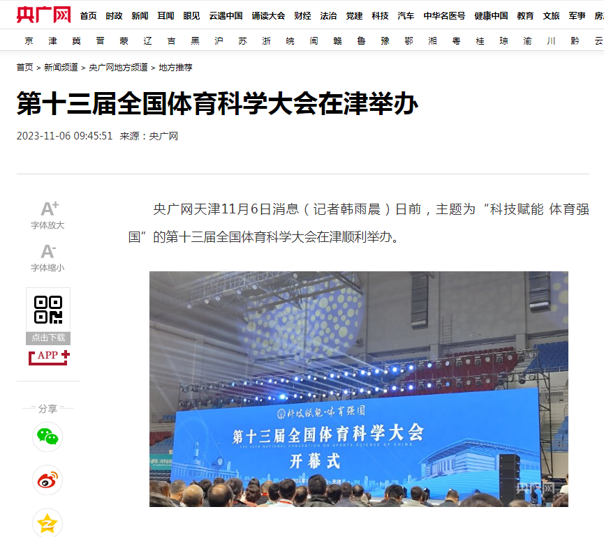 11月3日-5日,由中国体育科学学会主办,天津市教委、天津市体育局、天津体育学院、南开大学、天津大学、天津师范大学、天津工业大学、天津理工大学、天津中医药大学、天津城建大学、天津体育职业学院承办的第十三届全国体育科学大会在天津圆满举行。连日来,新华社、央广网、中国新闻网、《中国体育报》、中国教育新闻网、国家体育总局、天津电视台、《天津日报》、津云、天津广播等中央和我市多家媒体对此进行了报道。