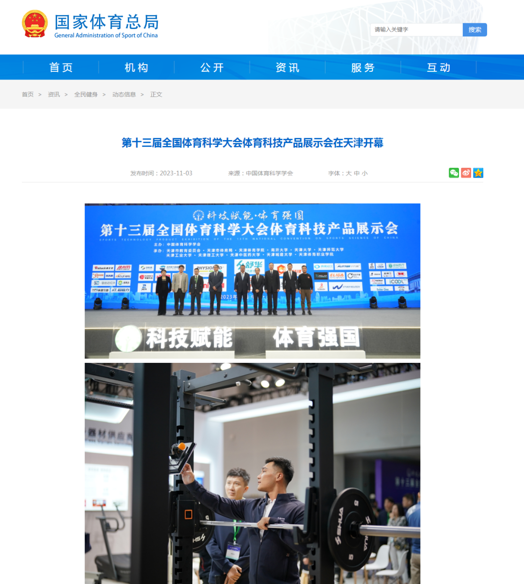 2023年11月3日下午,第十三届全国体育科学大会体育科技产品展示会在天津体育学院隆重开幕。新华社、央广网、国家体育总局官网、津云、北方网等中央和我市多家媒体对此进行了报道。