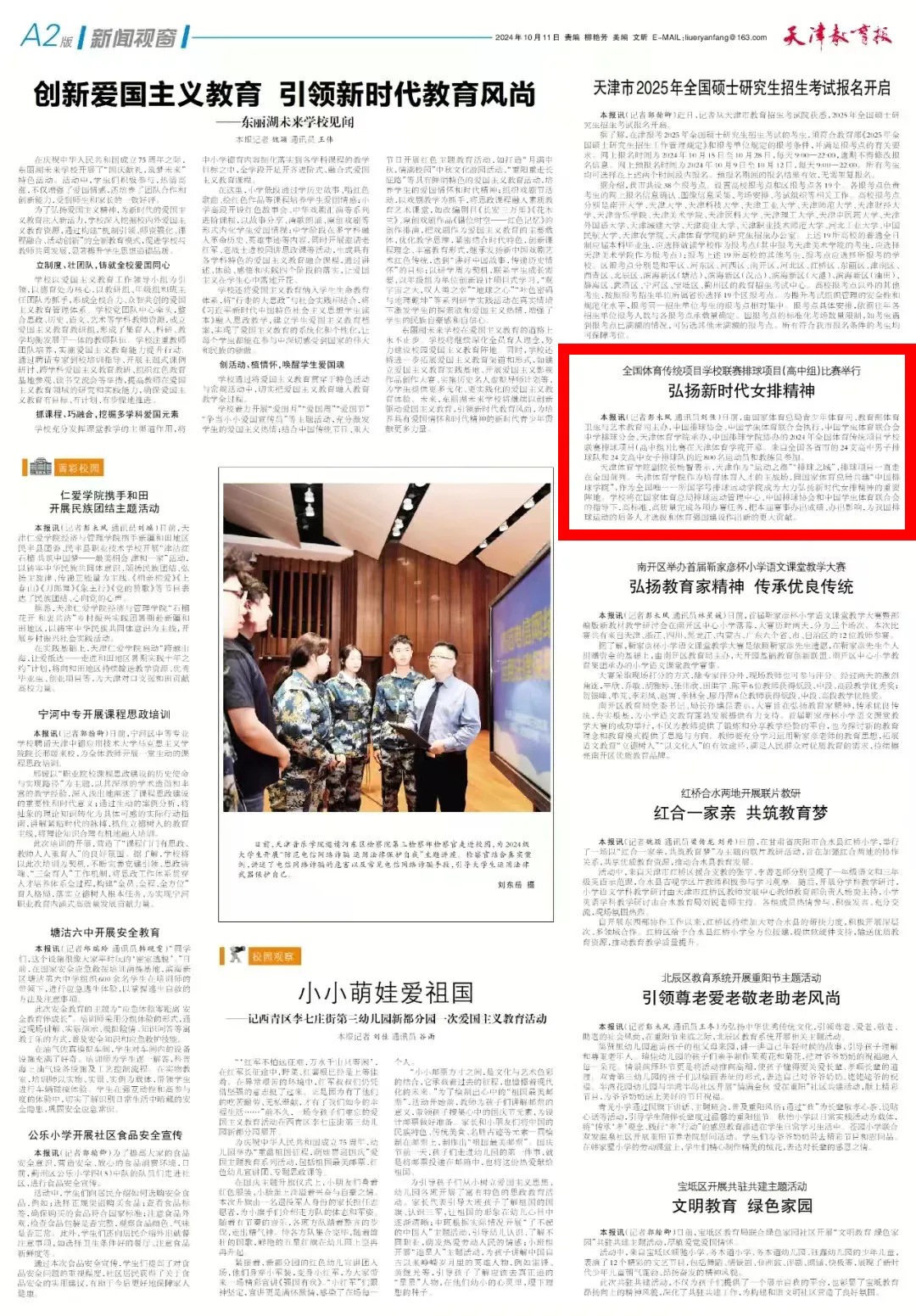日前,2024年全国体育传统项目学校联赛排球项目(高中组)比赛在我校举行,《天津教育报》对此进行了报道。