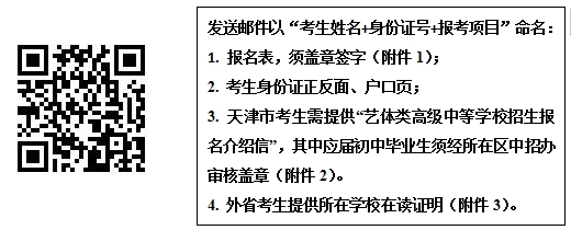 扫描以下二维码,填报考生相关信息,同时将以下材料(扫描件或照片)以电子邮件方式发送到邮箱:jjtx@tjus.edu.cn,相关附件材料见天津体育学院官网首页“通知公告”栏目中2022年天津体育学院附属中专部招生章程。