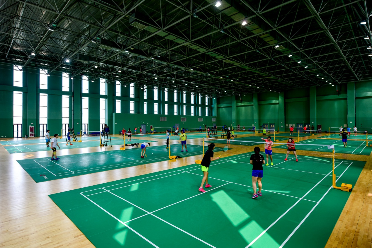 羽毛球馆建筑面积7277平方米,场地面积4580平方米。两个球馆,共24片标准场地,地面铺设地胶,馆内有良好的灯光照明、暖气、空调设备设施齐全,附属设施包括:贵宾室、淋浴室等,可承接各类羽毛球项目比赛和健身活动。