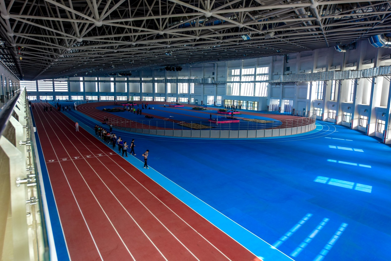 田径馆建筑面积1251平方米,场地面积864平方米,室内标准200米跑道,田径教学、训练设施设备齐全,功能完备,可承接各类比赛活动。